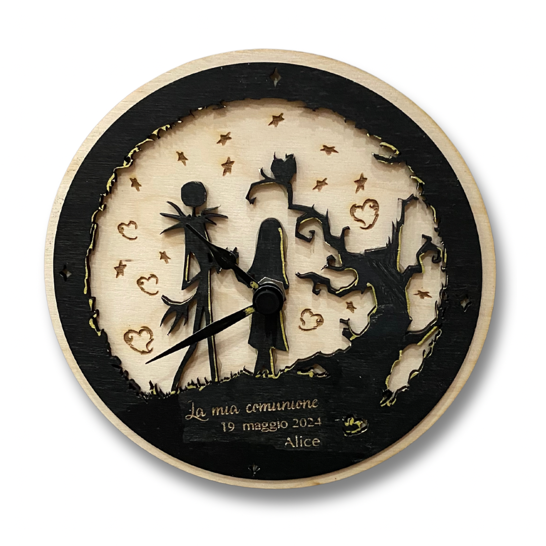 Bomboniere tema Nightmare Before Christmas, Orologio in Legno di betulla con disegno Alice nel paese delle meraviglie stilizzato, è una belllissima idea come bomboniera personalizzata.