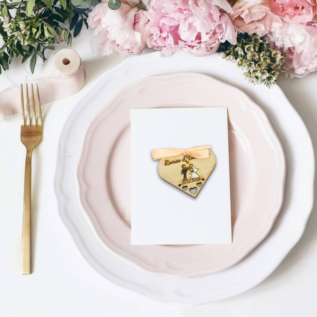 Segnaposto cuore con sposini - realizzato in legno di betulla